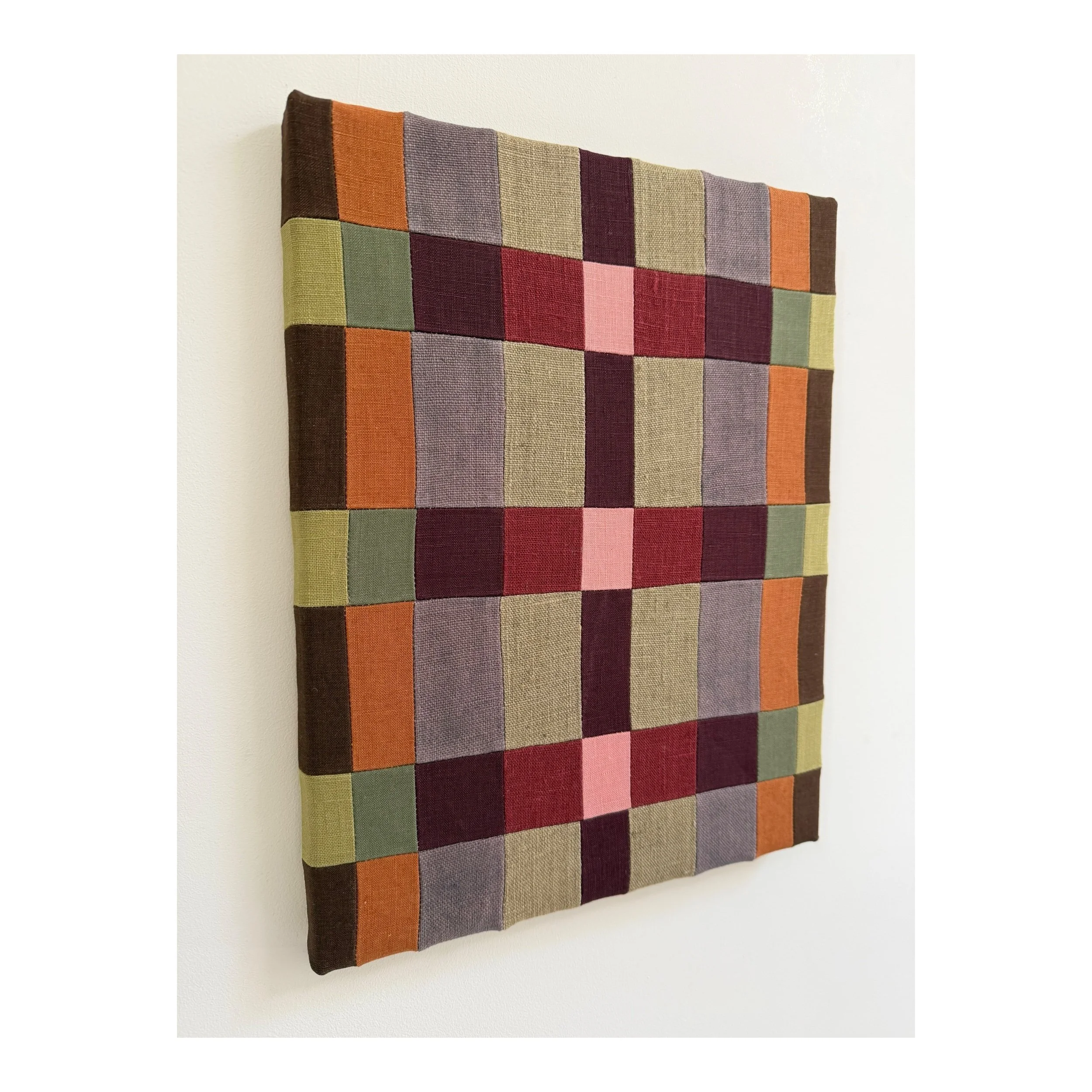 This graphic piece is created using colours selected from my archive of linen fabric. Carefully cut and pieced together in a collaged, patchwork technique, it is designed to be a balance of interacting colours both perfect and imperfect.